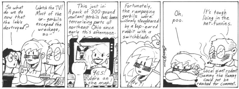 A rare nod to other webcomics. The homicidal (gerbilcidal?) bunny, is, of course, Bun-Bun from Sluggy Freelance, by Pete Abrams. Sammy the Hammy is a character in Melonpool, by Steve Troop. My friend Chris Gleason takes great pride in being the inspiration for Sammy. These and other webcomic sidekick characters played a major role in my choice of gerbils as the iconic small furry animals of Narbonic. Everything else was taken.