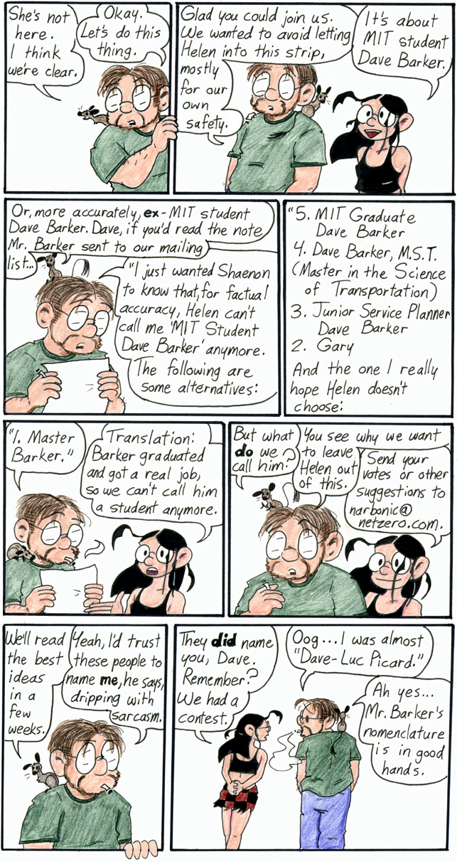 A silly strip I put together to congratulate Barker on getting his master’s. He works for the MTA now. Oh, and don’t try that email address; it doesn’t work anymore.