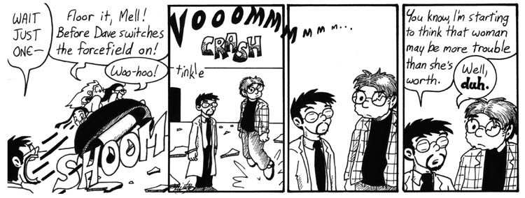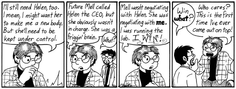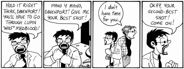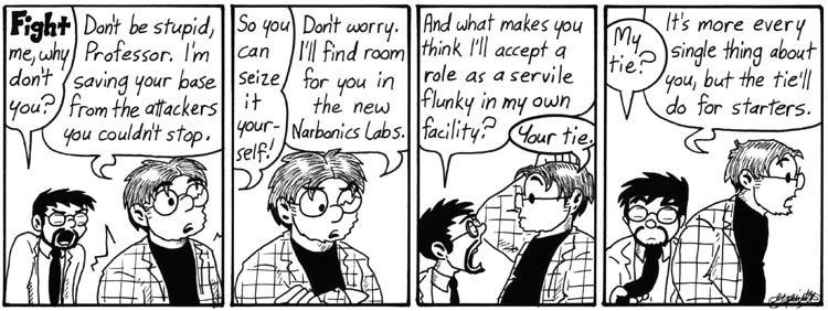 @jdreyfuss: I always interpreted Dave’s comment as a reference to the style of Madblood’s tie, like it was the sort of weak-willed tie a person who’d accept a role as a servile flunky in his own facility would wear. But your take on it–that the very existence of the tie means that Madblood is thinking more like someone else’s employee than like the self-employed scientist he is–is interesting, too; I hadn’t considered it that way.