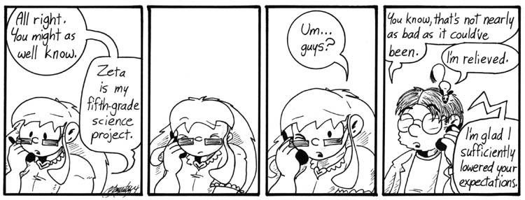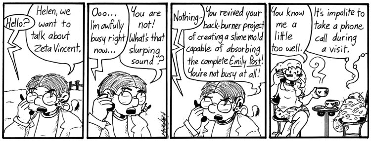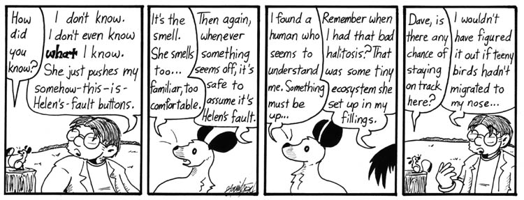 I wrote Dave’s dialogue in a stream-of-consciousness kind of way. This storyline contains a lot of references to random weird experiments Helen presumably conducts off-panel all the time. I think this is my second favorite one.