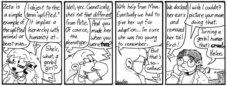 There are lines of Artie’s dialogue that delight me more than anything else in Narbonic, and the way he gets sidetracked into a politically-correct semantic argument here is the type of thing I love. He’s a very autobiographical character sometimes, at least when he’s being all fussy and absurd. Anyway, I like this and tomorrow’s strip for being less about the joke-punchline setup and more about the characters just having ridiculous conversations.
