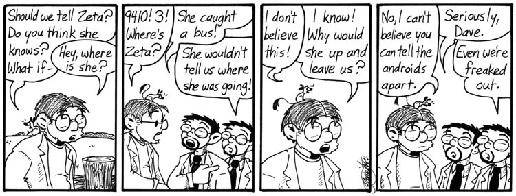 [SPOILERS] Being able to tell the creations of mad science apart seems to be a common superpower possessed by mad scientists. Helen was always able to distinguish between identical gerbils. The larger question is, why do I like to draw huge groups of identical characters? It gets pretty tedious after the first few strips.