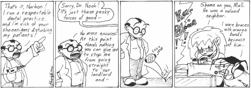 I like Dr. Noah’s weird little drill in the first panel. And Mell’s hate-filled expression in the last panel. And “Ka-Blooie!!”, with two exclamation points. And “poik!” Gosh, I wish I’d put more amusing sound effects into Narbonic. You can never, ever go wrong with amusing sound effects. Unless you’re not trying to be amusing, I guess.