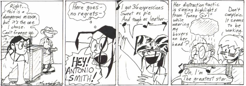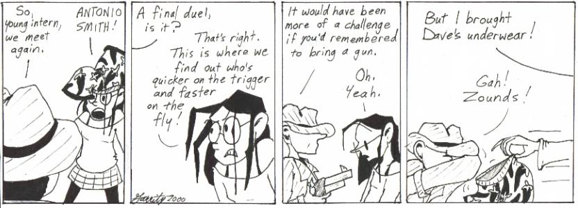 This is another strip that’s just too goofy for me to criticize much. I mean, Mell’s got the boxers on her head, and ANTONIO SMITH covers his face like the Bela Lugosi stand-in in Plan Nine from Outer Space when confronted with Dave’s chili-pepper-emblazoned boxers…come on, you gotta crack a smile.
