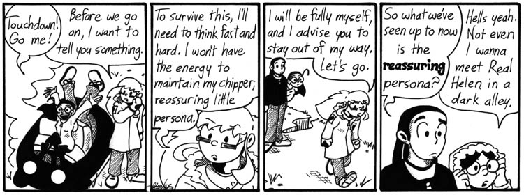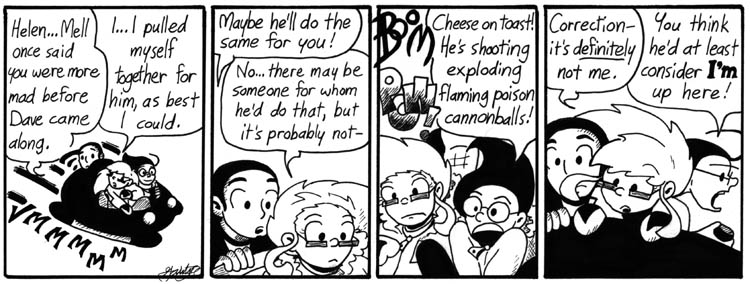 I like this strip a whole lot, even though, as with the earlier strip where Helen reveals that Dave isn’t primarily a mad computer scientist, the ominous foreshadowing never really pays off. We don’t get to see much of Real Helen. It’s probably just as well.