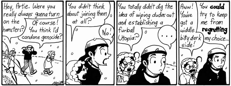This is mostly just a tying-up-the-plot-threads type strip, but I do enjoy any time Artie is at least a little bit openly evil. If he put his mind to it, he could probably do more damage than the rest of them combined. I also like the teeny little figures in the first panel. Establishing shot!