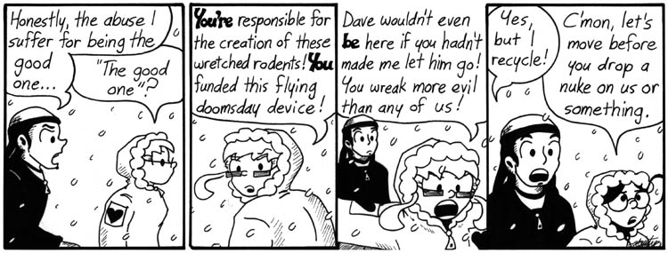 Is Helen right here? Probably only to the extent that everyone in the gang causes a lot of destruction, and Artie is the only one of them who doesn’t own it. One of the themes of Narbonic that developed without my conscious intention is that just good intentions–or bad intentions, for that matter–aren’t enough. Things tend not to go as people intended, unless those people are Helen, maybe.