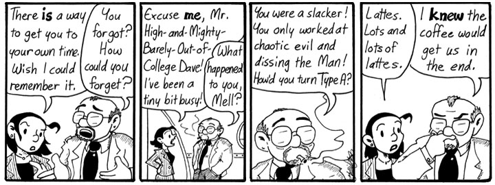 I like the fact that with this strip we get to see Dave completely rattled without actually disclosing any new information. And, of course, Mell utterly demolishing Dave’s composure with just one sentence.