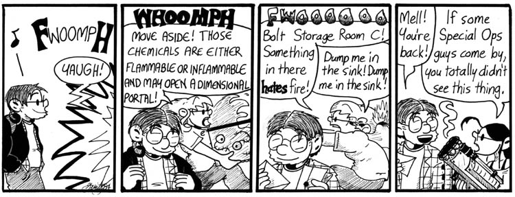 It irritates me that I didn’t draw the flames on Artie’s tail trailing behind him. Thanks to that, I can never fully enjoy this strip. Still, strips with lots of sound effects are cool, and I always liked “Those chemicals are either flammable or inflammable.” So please enjoy Mell’s triumphant return to Narbonic after three months away. Thank you.