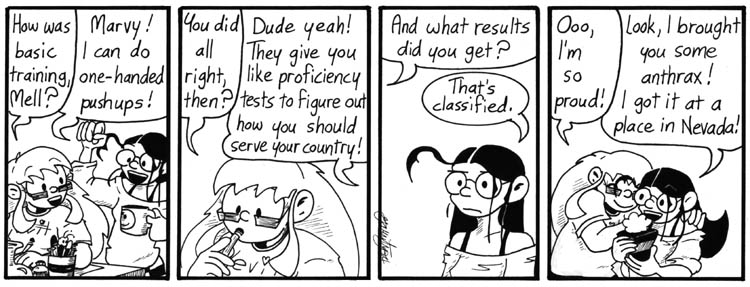 When my cousin Kim went through basic training, I was really envious of her ability to do one-handed pushups. That was pretty much my entire reason for drawing this strip. Because I think it would be cool to be able to do one-handed pushups.