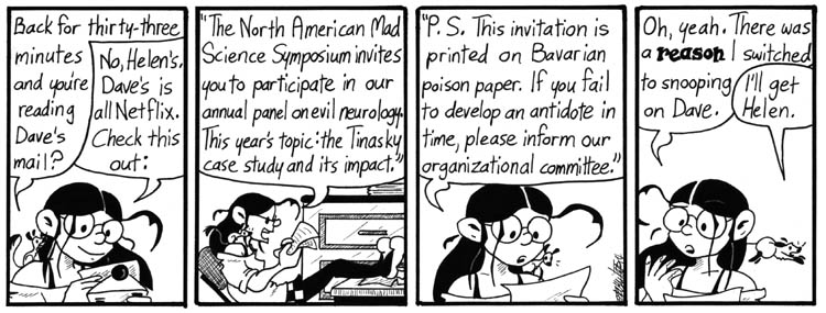 When I worked as the receptionist at Viz, I was in charge of sorting the mail, and those nerds had so much Netflix. Bavarian poison paper is a reference to the classic Michael O’Donoghue essay “How To Write Good,” from which I learned nearly everything I know about writing. I would comment more on this strip, but suddenly I am run over by a truck.