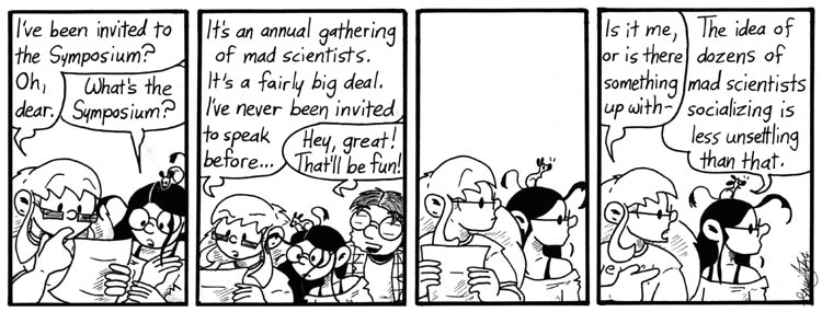 The basic concept of a mad-science conference was among the first storylines I came up with for Narbonic. It went through massive rewrites before somehow reaching the screen as “Professor Madblood and the Lovelace Affair.” Originally there was this whole plot about a booth-babe rebellion and the transmogrifier, it’s not important now. It all got ditched.