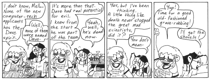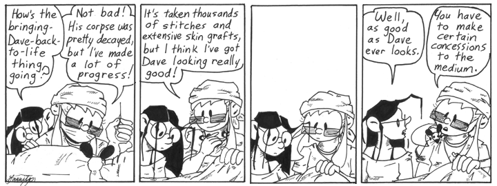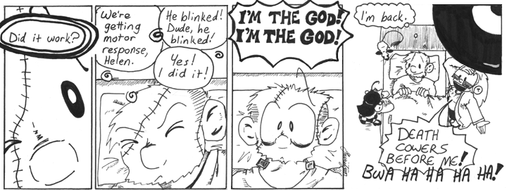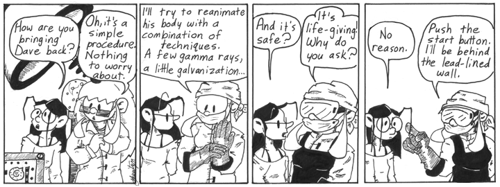 Incidentally, this was still early enough in Narbonic that characters could get away with doing things for little or no logical reason. If this sort of thing came up later in the strip, I’d probably have to devise some strong, plausible reason for Helen to want to bring Dave back to life, but here she just does it because she’s bored and can’t find a good replacement for him.