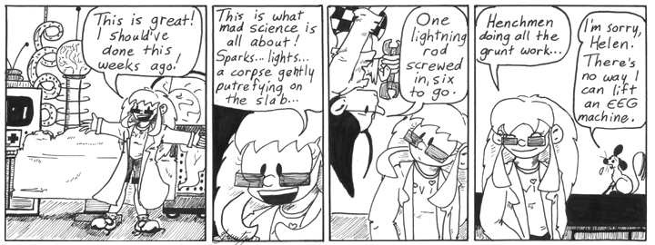 Even though I don’t know what half the equipment in the first panel is supposed to be, I like this strip. It’s one of the quintessential Narbonic strips, the kind you can show to people to give them an idea of what the comic is all about. Also, Mell looks hot upside-down with her hair flying around. Later, in the Moon storyline, I did a lot with that look.
