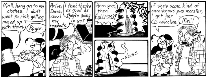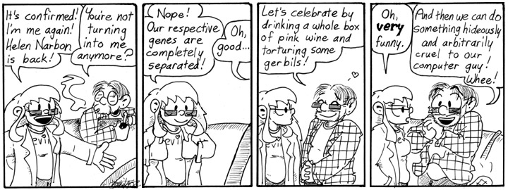 I remember Joey Manley, who did not often comment on Narbonic, predicting that the extra Dave biomatter would cause trouble later on. Alas, no, I just used it for a cheap joke and never brought it up again. I’m sorry.