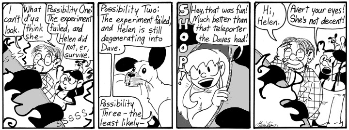 “Weeks ago“? It was about, what, 14 days after the teleporter mishap (before which they were, you know, on the island) when Helen asked Dave out? And the day after was when she started looking for a fix, and assuming the new telepods took about a day of construction, that brings us to this strip. Hmmmm.