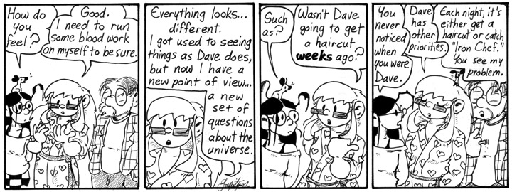 A good ol’ post-transformation epilogue strip. Being in a different form for any length of time tends to broaden leave one’s horizons broadened when they return to their natural form. In this case, residual sympathy for Dave’s so-called hobbies.