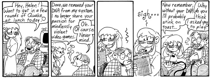 This was one of the very first strips I wrote for this storyline. Yes, the whole long thing was just a buildup to the one time Dave gets to zing Helen. Enjoy it while you can, Dave.