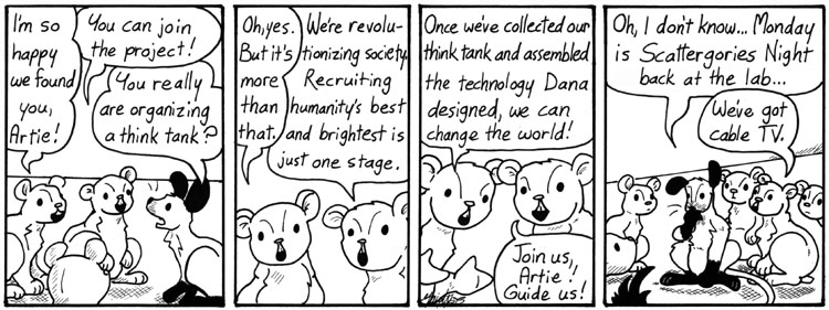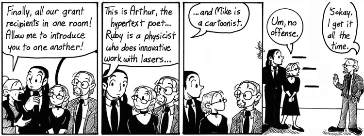 Mike is based on my friend Dirk Tiede, creator of Paradigm Shift, and Ruby is based on his wife Emily, a laser scientist. I’m usually not very good at drawing caricatures of specific people, but that’s a pretty damn good likeness of Dirk, if I dare say so myself. Emily/Ruby came out okay, but I’d probably draw her differently now.