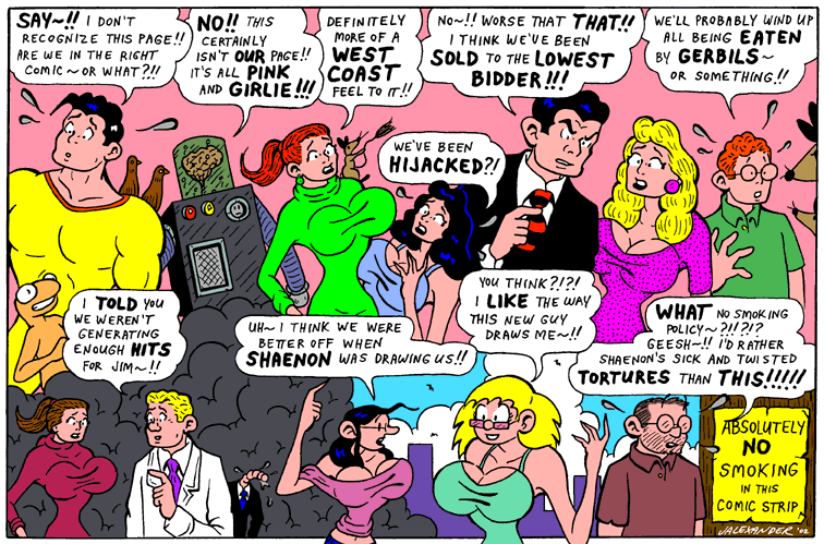 What else do we have this Sunday? I know! Years ago, Jim Alexander, creator of Algernon’s Dilemma, drew a Narbonic guest strip that I never used for some reason. I’m sorry, Jim. Anyway, he reminded me of this and send me a fresh copy of the strip, and here it is. Jim draws, ahem, rather busty ladies, a fact upon which I may have commented in our email conversations.