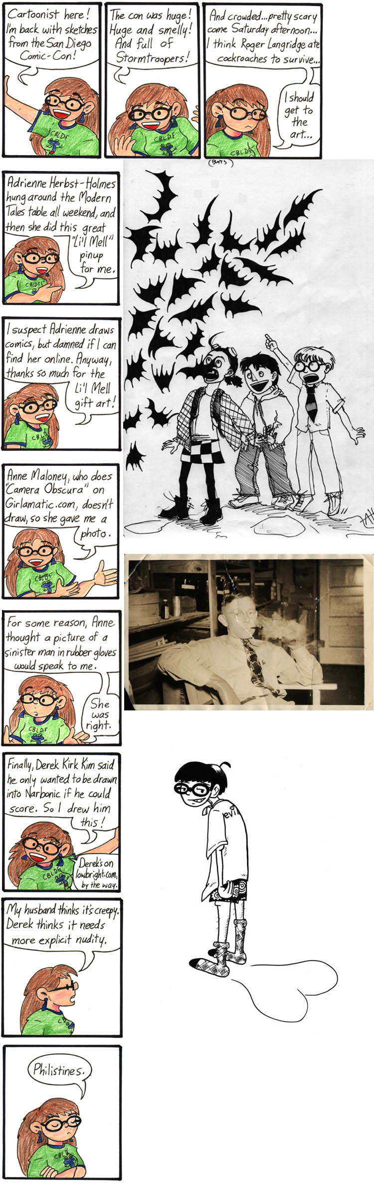 The thing about Roger Langridge is only partly a joke. He shared a room at San Diego’s filthiest hotel with Spike and her then-boyfriend (now husband). They called the front desk to complain about all the cockroaches, and the desk attendant said not to worry about them because they were “water roaches.” Roger had to sleep on the floor with the water roaches. Comic-Con is a cruel mistress.
