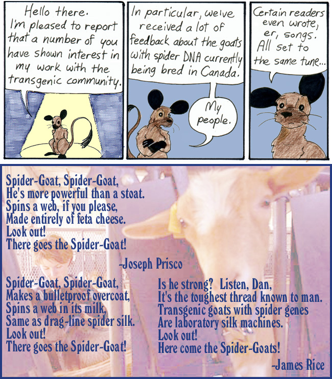 1. “We know who’s genes Helen-Dave has. And we know that the Spider-goatshave spider genes. But if Artie is going to be the self-appointedspokesgerbil for the trasgenic community, shouldn’t we know who, orwhat genes he has? Clearly, he’s mostly gerbil, but what else does hehave inside him? Whatever it is, it’s not what made him smart, thatwas the intelligence serum. His transgenic genes kept him from goinginsane from the serum. If his trasgenic genes are human, was itHelen, Mell, or Dave’s genes? I’m guessing Dave. He’s clearly theone with the most sanity.”