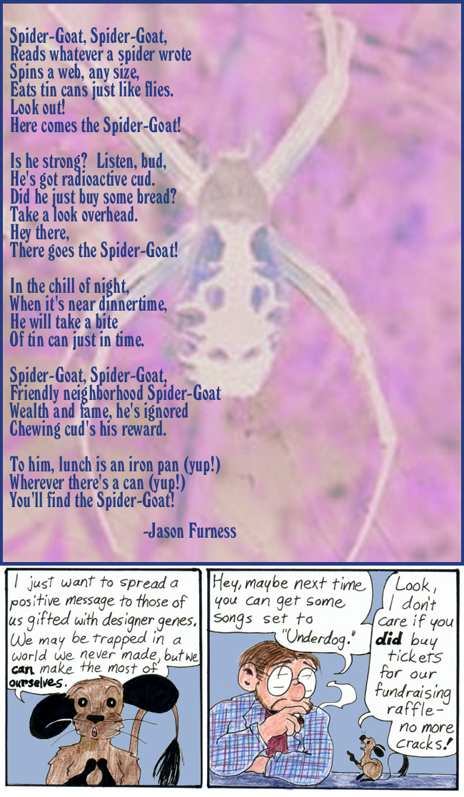 Like I said, the Canadian spider-goats captured readers’ imaginations. I think my favorite line is, “Spins a web, if you please / Made entirely of feta cheese.” Because I really like cheese.