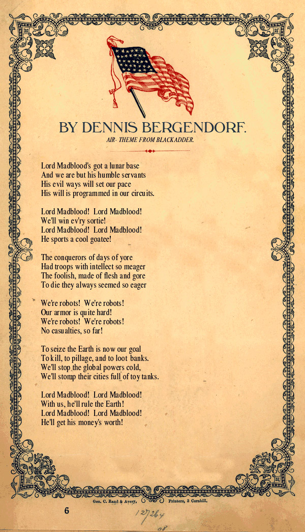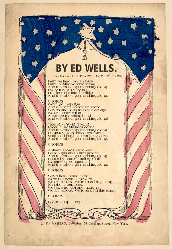 Another good one! I’m always amazed by the things people send me. The fan art and filk and things are usually better than my own creative efforts, which is puzzling, but strangely flattering. I guess what I’m trying to say is, thanks to everybody who wrote me android battle anthems.
