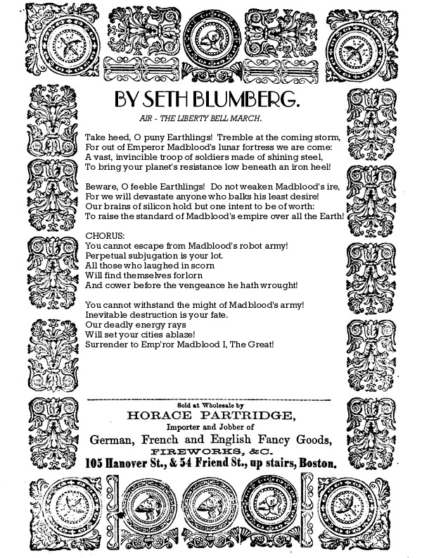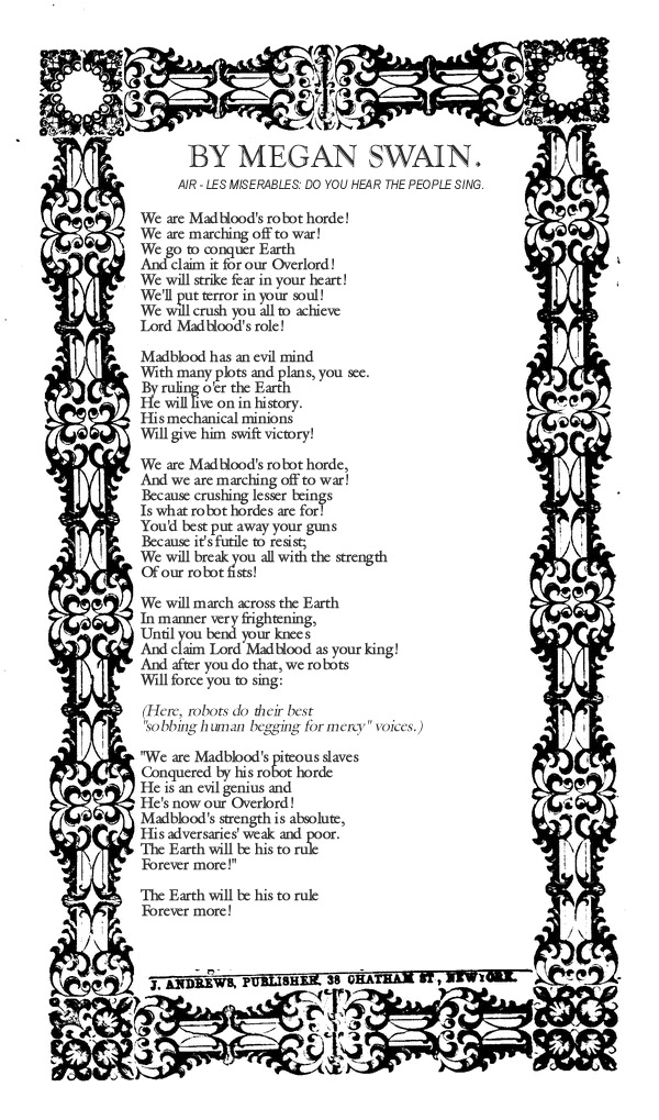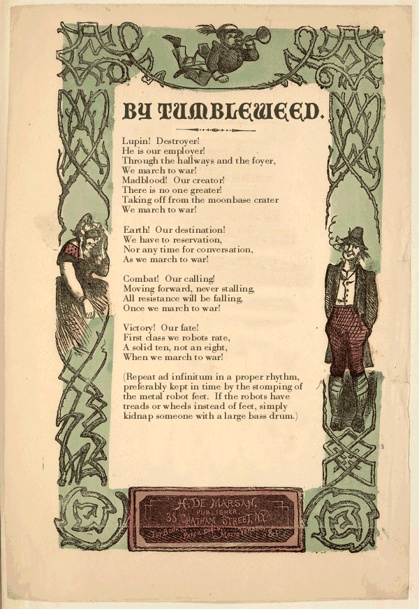 I think this is the only entry that acknowledges that the writer has no idea what these robots look like. Also, this is another amazing sheet-music border.