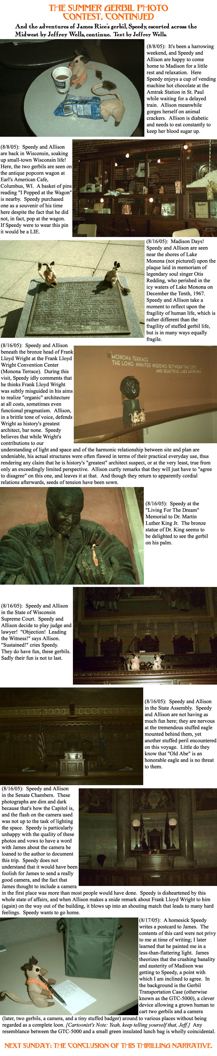 Just to set the record straight about Speedy’s trip to Narbonicon, the only arranging I did was buy Speedy’s ticket into the convention (I wanted the soundtrack album), and I bought Speedy’s first-class transportation to Wisconsin. Oh, and I included a cheap digital camera. Everything else you see and read was the result of Jeffery; I had no part in any of it. All I was expecting back was some cool songs and a few simple pictures. Instead, I get back a box crammed with fliers from everywhere they visited, some kind of popcorn wagon badges, and some weird little stuffed badger, apparently on the run from gamboling debts!??
