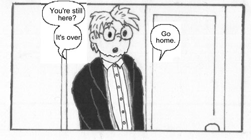 This is the only day in six and a half years of Narbonic that I ever missed an update, and my reason was utterly ignoble. It was, of course, because I had a brand-new boyfriend, I was spending every weekend in the city with him, and one Sunday I just blew off going home to Pacifica to draw a comic and update the site. “Screw the readers!” I chortled, rubbing my hands in a menacing way. “I’m going to go make out!”