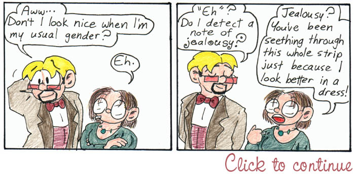 Yeah, I had to do at least one Sunday strip with the gender-swapped characters. Since I cut the plotline in the daily strips that involved putting Dave in a dress, I did it here. Besides darkening Helen’s vest and tie to magenta rather than pink, I kept the characters in the same basic color schemes they follow in their usual bodies. Dave almost always wears earth tones.