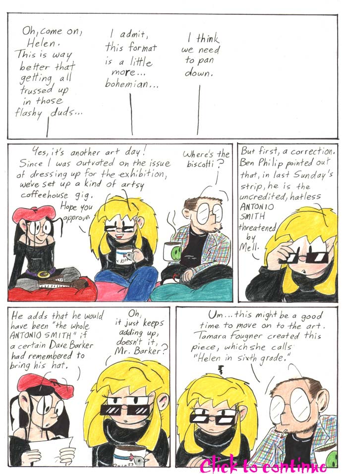 Oh, great. The second Art Day strip, and I’m already straining to think of ways to dress the characters. I’m not very creative with clothes. These are cute, though, especially Helen swapping out her rose-colored glasses for black ones. Helen’s got her 6.02×10^23 mole mug again. I should’ve drawn that more often.