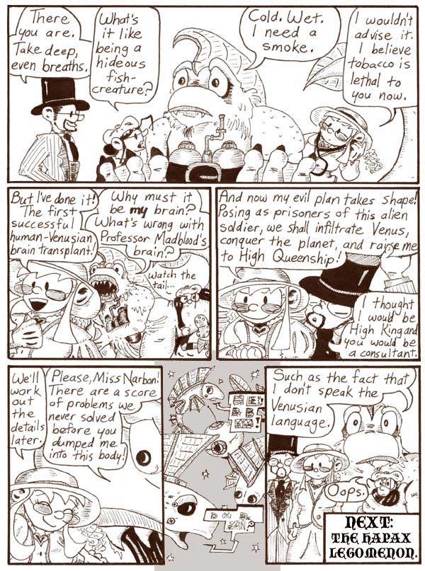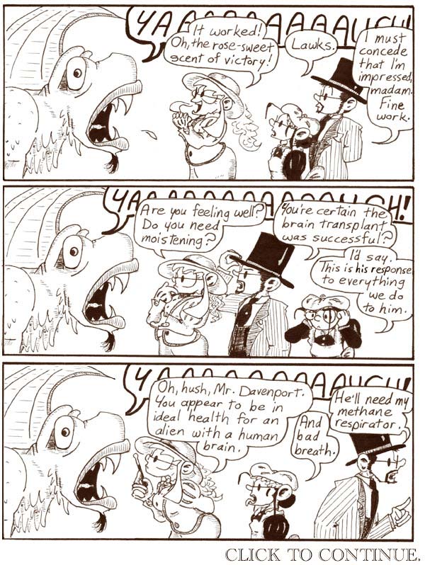 This plot development was inspired by “The Lost World,” a comics serial by Lily Renee that ran in Planet Comics in the 1940s. “The Lost World” takes place on a post-apocalyptic Earth where a small band of humans fights against alien overlords, and at one point one of the human characters gets brain-swapped with one of the alien Voltans. After that he goes around for the rest of the story as a human in a Voltan body. Also, this is unconnected to anything in Narbonic, but I just want to note that the leader of the human resistance in “The Lost World” is a shirtless man with a bow and arrows named Hunt Bowman, which is awesome.