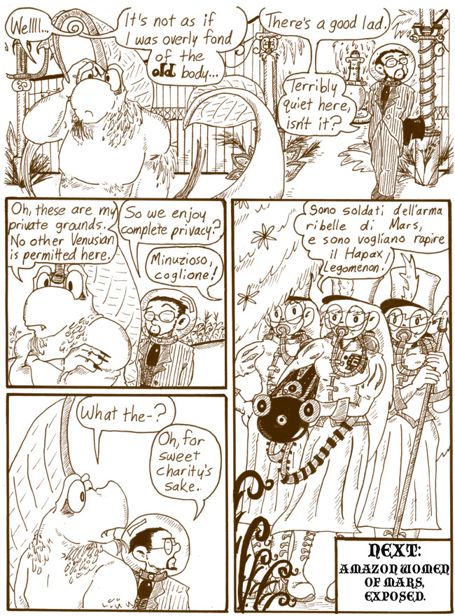 The Martian ladies speak very bad Italian. Andrew did the translations for me. In panel two, they say, “Not quite, coglione!” Coglione in this context means “idiot,” but it’s also a word for “testicle.” In panel four, they say, “We are soldiers of the rebel army of Mars, and we are here to kidnap the Hapax Legomenon!”
