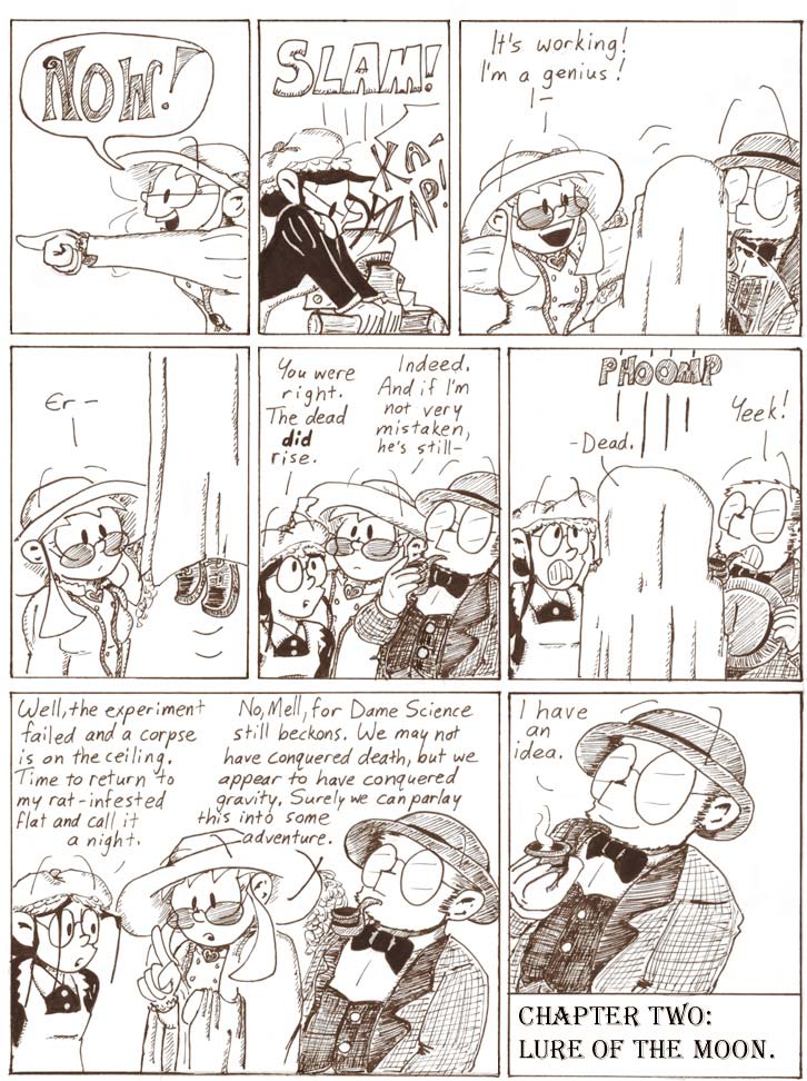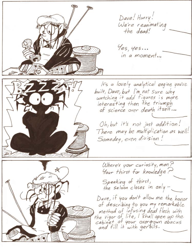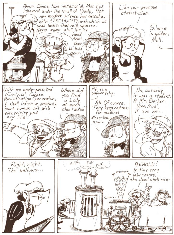 Oh, boy! The first installment of the Victorian serial! This ended up being one of the most popular features in Narbonic. It came about because I was whining and complaining about having to think of something to post on Sunday (a weekly ritual for six and a half long years), and my roommate, Mark, suggested doing a Victorian steampunk serial. He also showed me how to use the duotone setting on Photoshop to create sepia. Thanks, Mark!