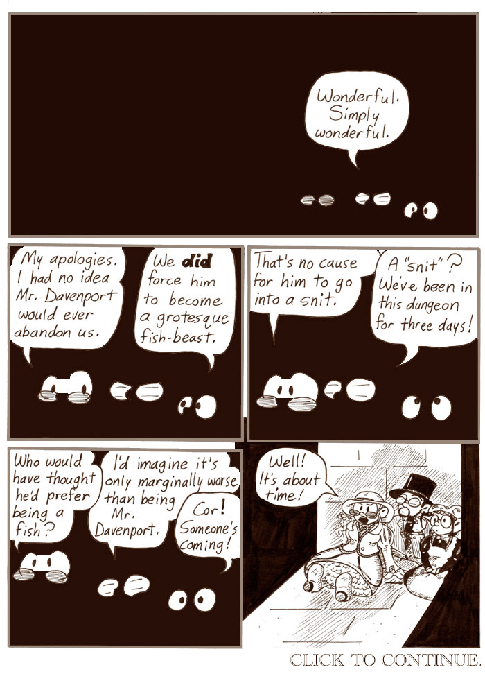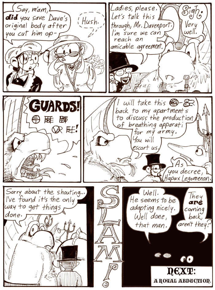 By this point I’d pretty much gotten a handle on drawing the Hapax Legomenon–or Dave as the Hapax Legomenon, whatever. I still like his expression and pose in the next to last panel, as well as the alarming number of razor-sharp teeth he shows whenever he shouts. Weak, timid body language from a powerful-looking body is always pretty funny; I ended up doing essentially the same thing with Artie’s human form later on.