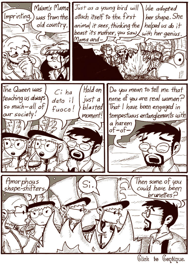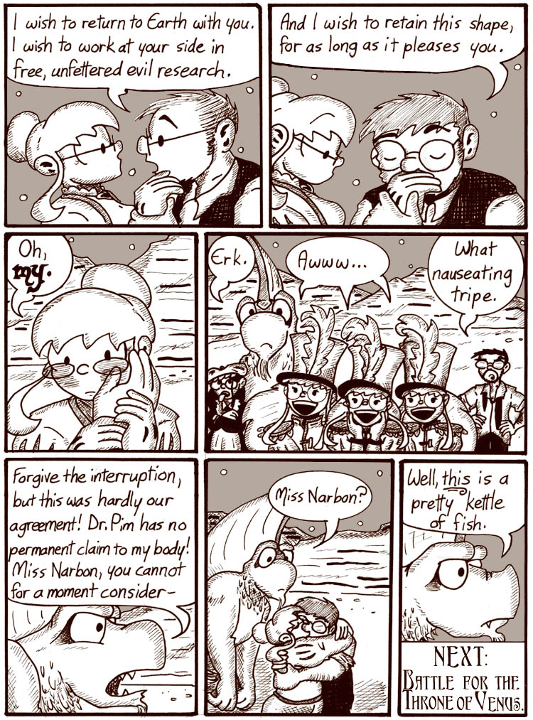 I think I would be awesome at writing romance novels, provided they starred brain-swapping octopus men. It’s too bad Dave can’t be this smooth himself, either here or in regular Narbonic continuity. Regular Dave seems to do okay, though.