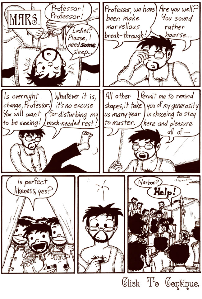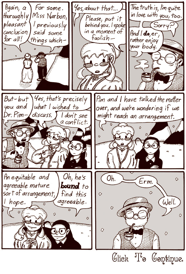 Obviously I wouldn’t do this kind of thing in the main Narbonic storyline, but it struck me as funny for the side story. Victorians were always getting up to kinky stuff.