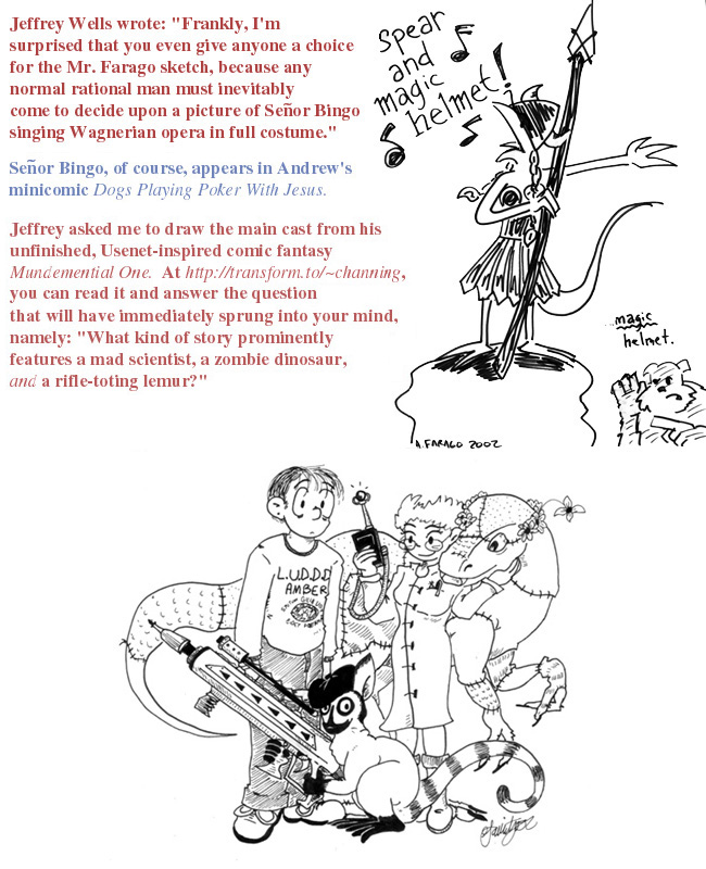 Everybody in the Mundementia drawing turned out pretty well except for Charles, the nondescript male protagonist. I don’t like his face at all. The other characters look about right, though. The lemur was the hardest part. And this was probably the tipping point in the me/Jeffrey relationship. From here on out we were total BFFs.