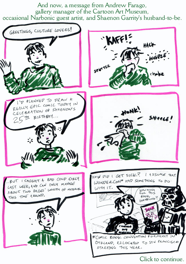 Aw, look, it’s Andrew, and he made me a birthday strip! Even though he’s sick! We both got sick as dogs at Wondercon that year. Wondercon has felled me more than once. What can I say, it’s a germy con.