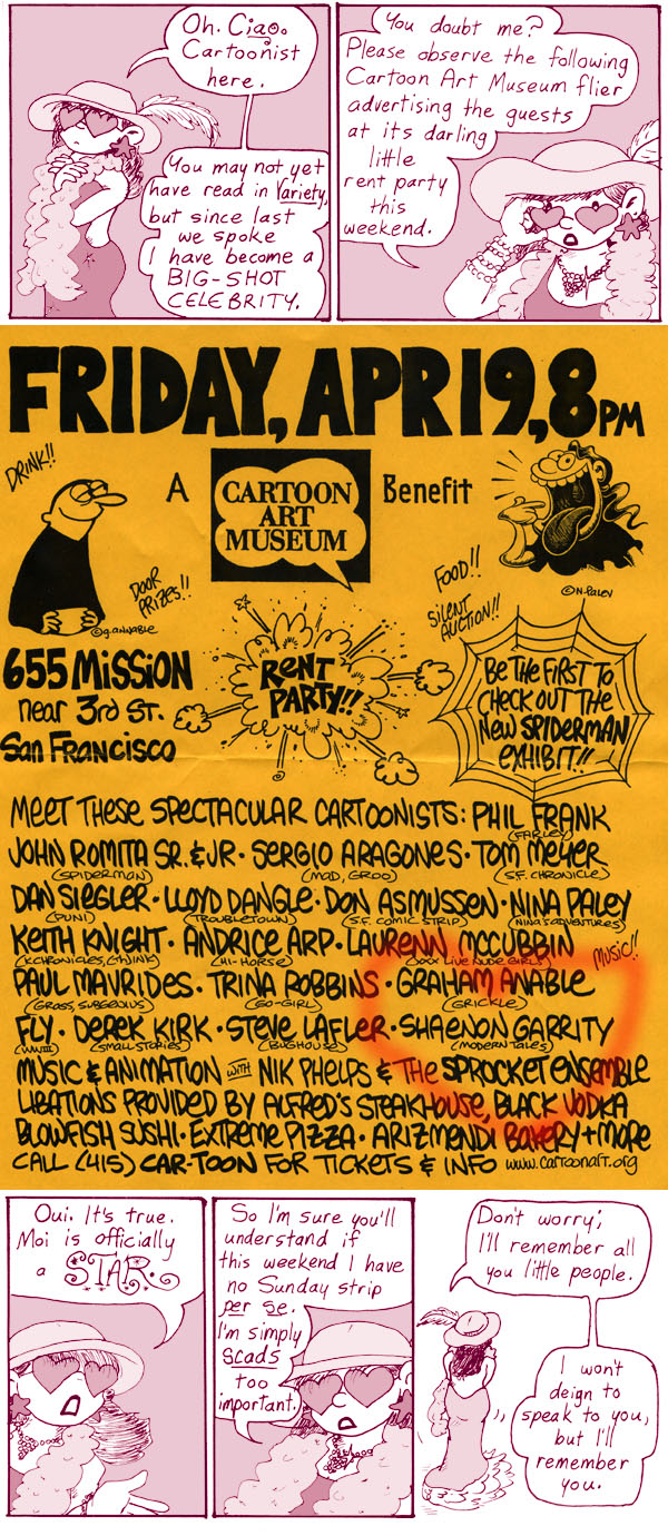 Keith Knight made the poster. Thanks, Keef. Oh, and the Spider-Man show, “Web-Slinging and Wall-Crawling,” was the first Cartoon Art Museum show that Andrew helped curate. So all in all this was a heck of a rent party.