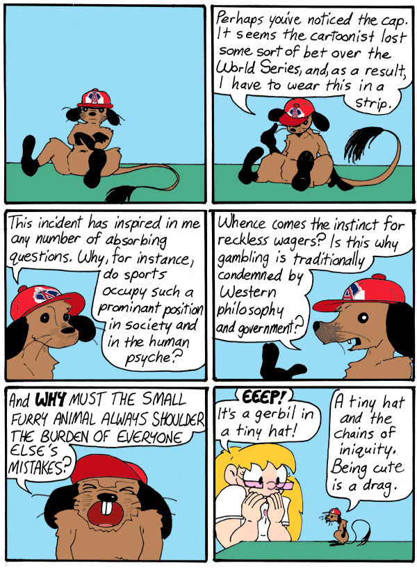 This of course is one of my all time favorite Narbonic strips, and the first Sunday strip I ever owned. I worked practically in the shadow of Angel stadium, and when the Angels made it to the World Series against the San Francisco Giants, I had to try and make some sort of a bet with the only person I knew in San Francisco. Unfortunately, Shaenon wouldn’t bet. At least not right away. She waited until the Giants were up 3 games to 2 before she finally agreed. The bet was $20 vs. at some point one of her characters had to wear an Angels hat in a strip. When they won, I didn’t know what to expect, but it certainly wasn’t this. Shaenon also sent me the original, uncolored strip. It is one of my most prized pieces of animation or comic strip art.