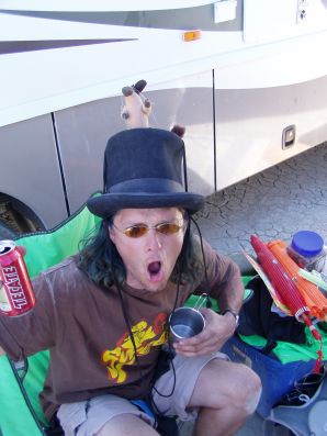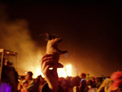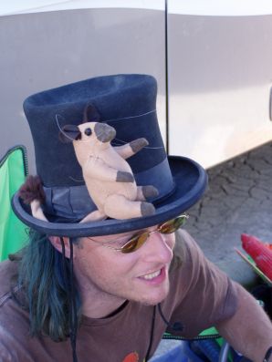 And speaking of gerbil photos, I’ve got another Director’s Cut bonus. Chris Ellmann, of tiny text fame, has sent me photos of his gerbil at Burning Man! Kismet! These are from Burning Man 2006. All notes below are by Chris.