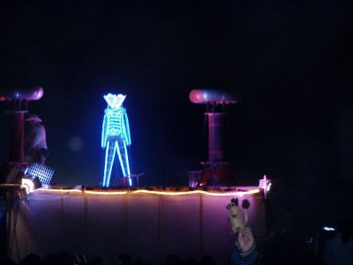 The man is framed by Dr Megavolt’s tesla coils. After a few dozen attempts to get a non blurry picture that also included lightning bolts, I gave up.