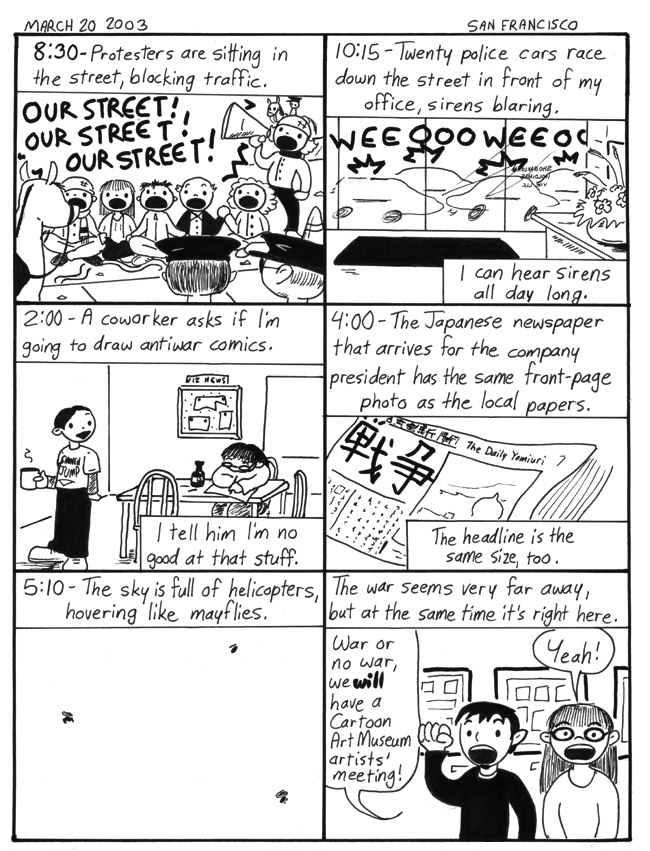 I don’t like to talk politics on my webcomics sites (I didn’t do any comics about September 11, although I did post emergency information on my site), but around this time I was frustrated by the lack of media coverage of protests against the Iraq war. Of course, I live in San Francisco, which is Crazy Hippie Town as far as the rest of the nation is concerned, so I guess it’s not news if thousands of people take to the streets here. But the same thing happened in many other cities. Now it seems the media is all too happy to cover protests against the government, as long as they involve angry retirees in sunglasses waving swastikas and guns and spouting conspiracy theories about secret anti-Palin government eugenics programs. It’s frustrating.
