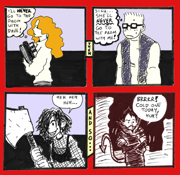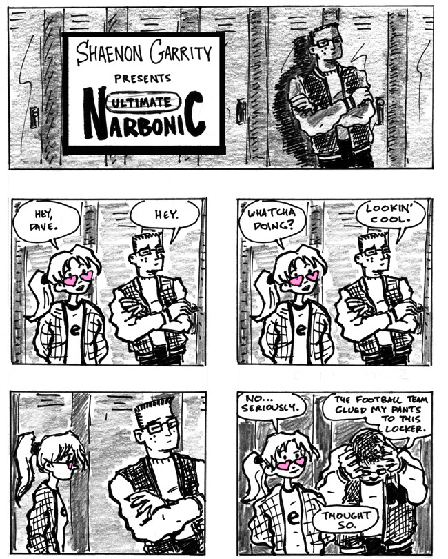 I know I’m biased because he has sex with me and all, but I’m partial to Andrew’s “Ultimate Narbonic” week. (Yes, that’s why it shows up twice in this update–that, and it’s the easiest way to get it to display on the frontpage using Tooncasting.) This was not long after Marvel launched its “Ultimate” line of relaunched properties theoretically aimed at new, younger, hipper readers, so we had talked about what a hip teen relaunch of Narbonic would entail. In Andrew’s vision, it’s kind of like a John Hughes movie. Also, as always, I enjoy his inexplicably badass Dave.