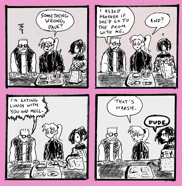 You can tell that Ultimate Narbonic takes place in an alternate universe because Helen and Mell are helping Dave get a date, as opposed to actively sabotaging any and all attempts he might make at a normal life.