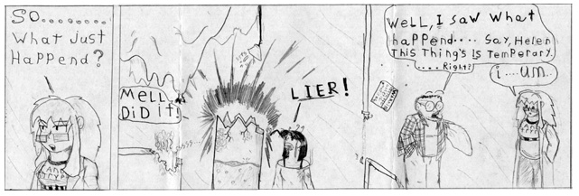 27. Top comic, last panel:  Add a thought balloon for Mell, “I can’t believe Heather only charged me $500 to take out Dave … wonder if I can salvage his skull for a hood ornament?”