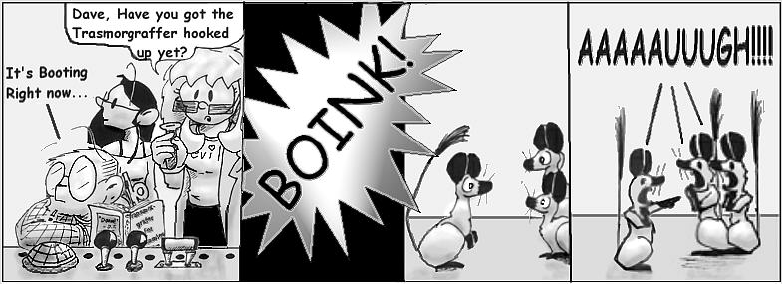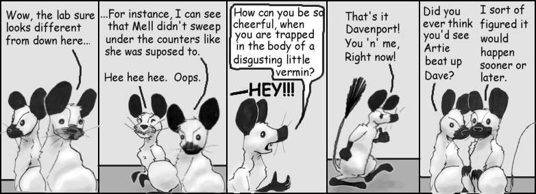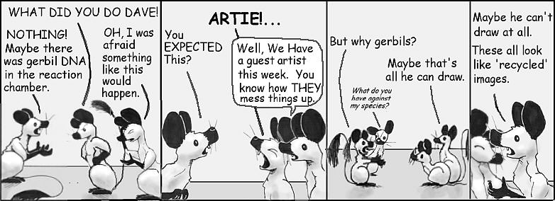 2. Opps.  I inteneded to send Shaenon info to post about these strips.  Yes, the images are taken from Narbonic strips and edited into a new strip.  I did want to change the style a little so I added some shading and other accents.  As Ed noted above the, the BOINK sound effect is a nod to Calvin and Hobbes.  It seemed to me that sooner or later, one of the human characters, most likely Dave, was going to end up as a gerbil.  This story was my idea of how it would happen.  I included Helen and Mell because they seemed to be left out of such things.